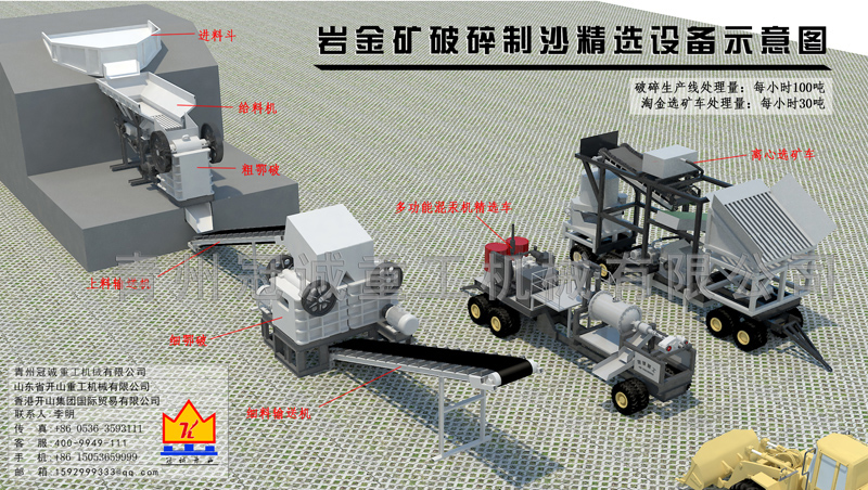 破碎生產(chǎn)線+巖金礦破碎制沙離心選礦車+混汞機車